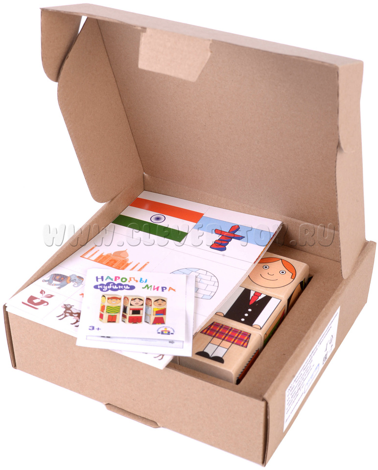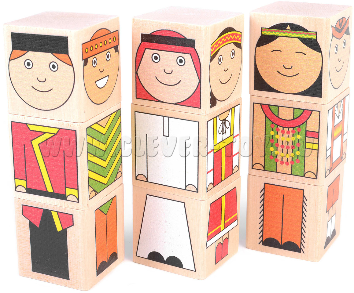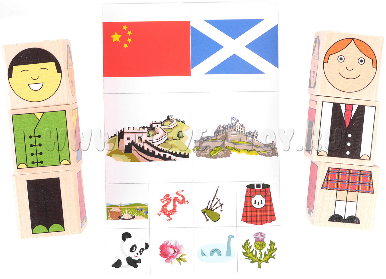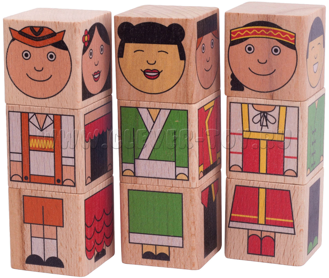 В комплект входит 9 деревянных кубиков. На 4-х гранях каждого кубика нанесена яркая картинка – часть тела забавных человечков разных национальностей. Картинки расположены таким образом, что можно ставить кубики друг на друга, чтобы получался вертикальный «кубический человечек».