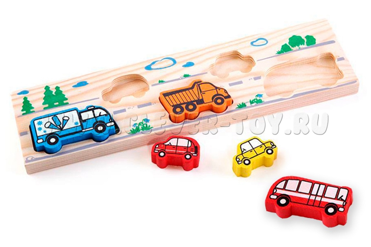 Деревянная рамка-Вкладыш "Транспорт" состоит из 5 фигурок автомобилей (легковых и грузовых) и рамки, в подходящие по форме отверстия которой нужно установить соответствующие детали.