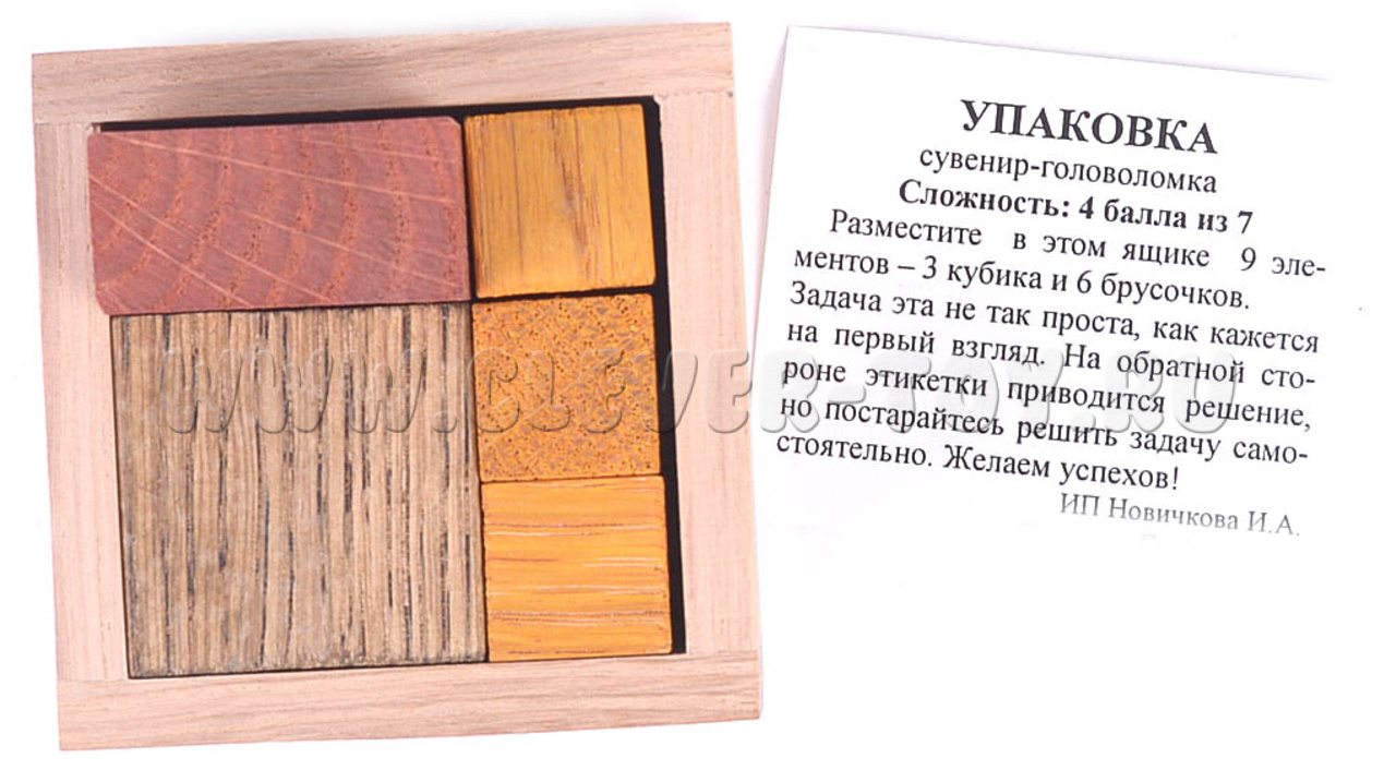 Головоломка “Упаковка” – небольших размеров коробочка с 9 деталями. Однако все не так просто. Ваше задание – уложить все детали (т.е. упаковать), что бы поверхность коробочки стала гладкой.