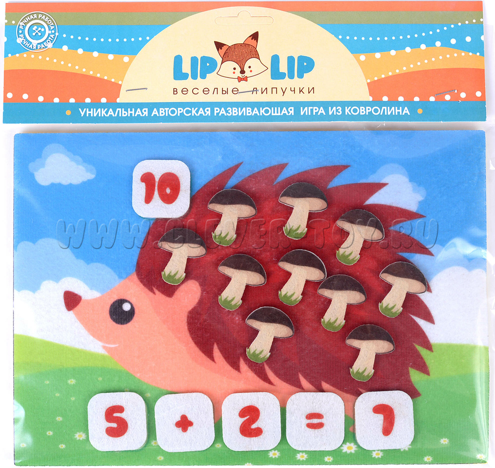 Малыш получит огромное удовольствие, нацепляя на колючки лесного добряка грибы и яблоки, учась в процессе считать предметы. «Сколько грибов на спине у ежика? А сколько яблок?» - вот только один из вариантов игры с мягкой аппликацией. А если нужно освоить сложение или вычитание? Не проблема! Помимо грибов и яблок, в игре есть цифры и арифметические знаки.