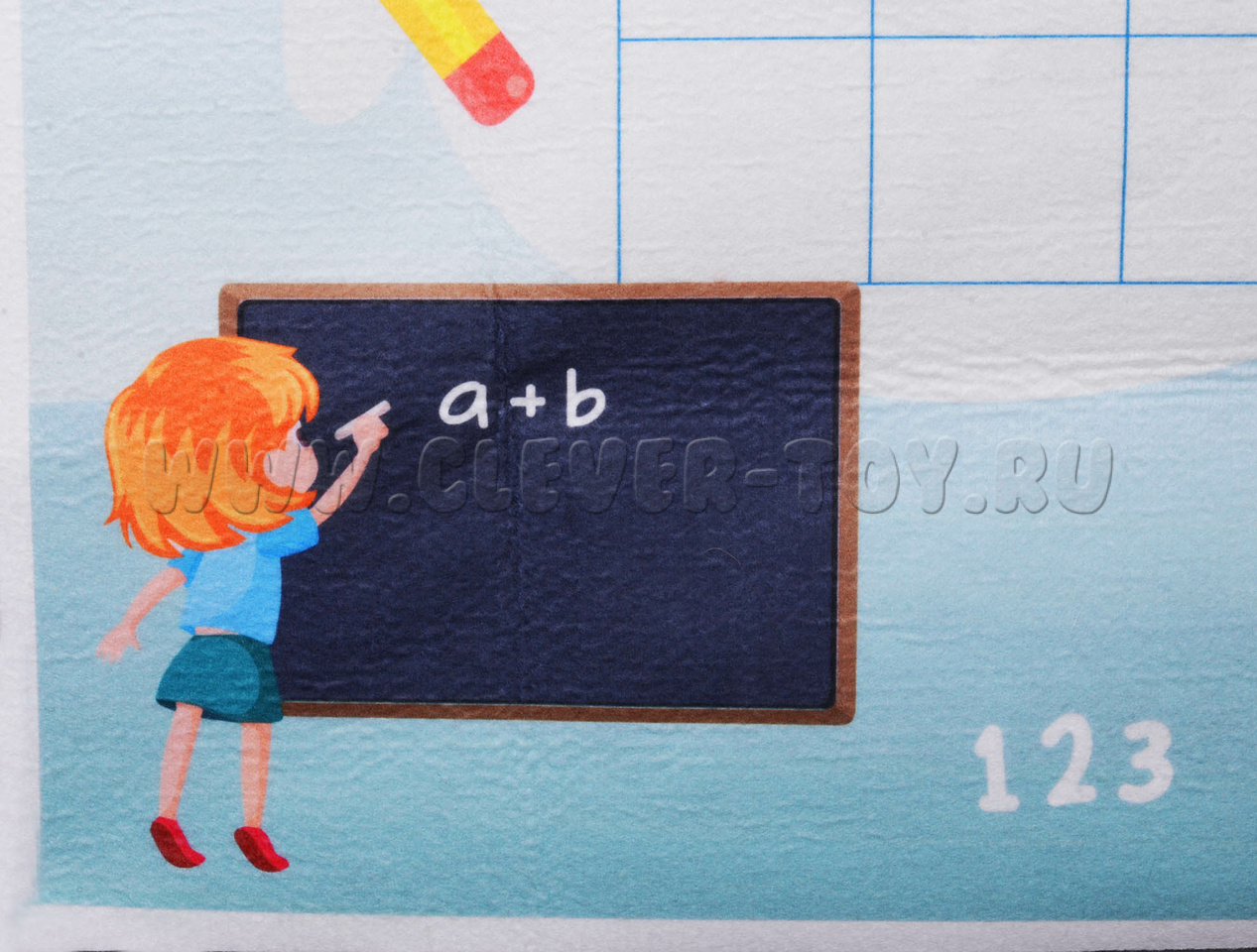 В упаковке находится большое игровое панно с нанесёнными на него клетками, что поможет детям в игровой форме познакомиться с понятиями «Цифра», «Число», «Сложение», «Вычитание», «Равенство» и т.д. В дальнейшем – в начальной школе – ребёнок будет психологически готов к урокам по математике. Вокруг клеток также есть изображения различных школьных атрибутов, маленькая школьная доска.