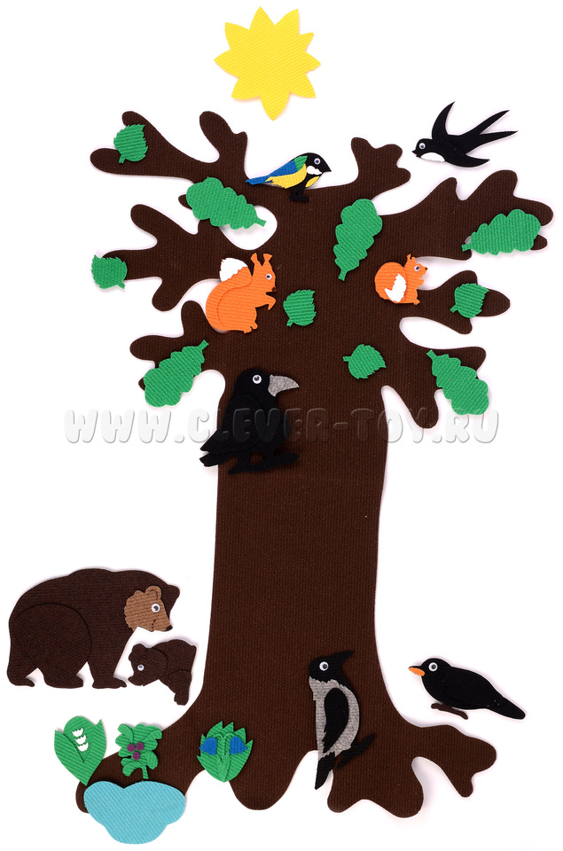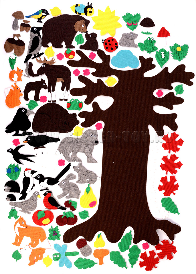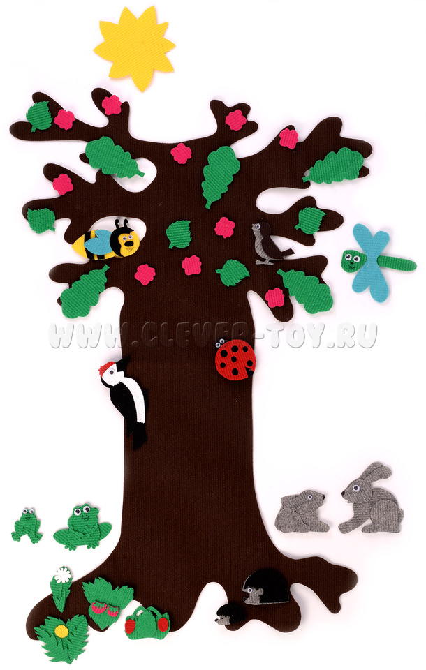 • элементы окружающего мира - большое дерево, солнце, облако, снежинки, цветочки, листья;