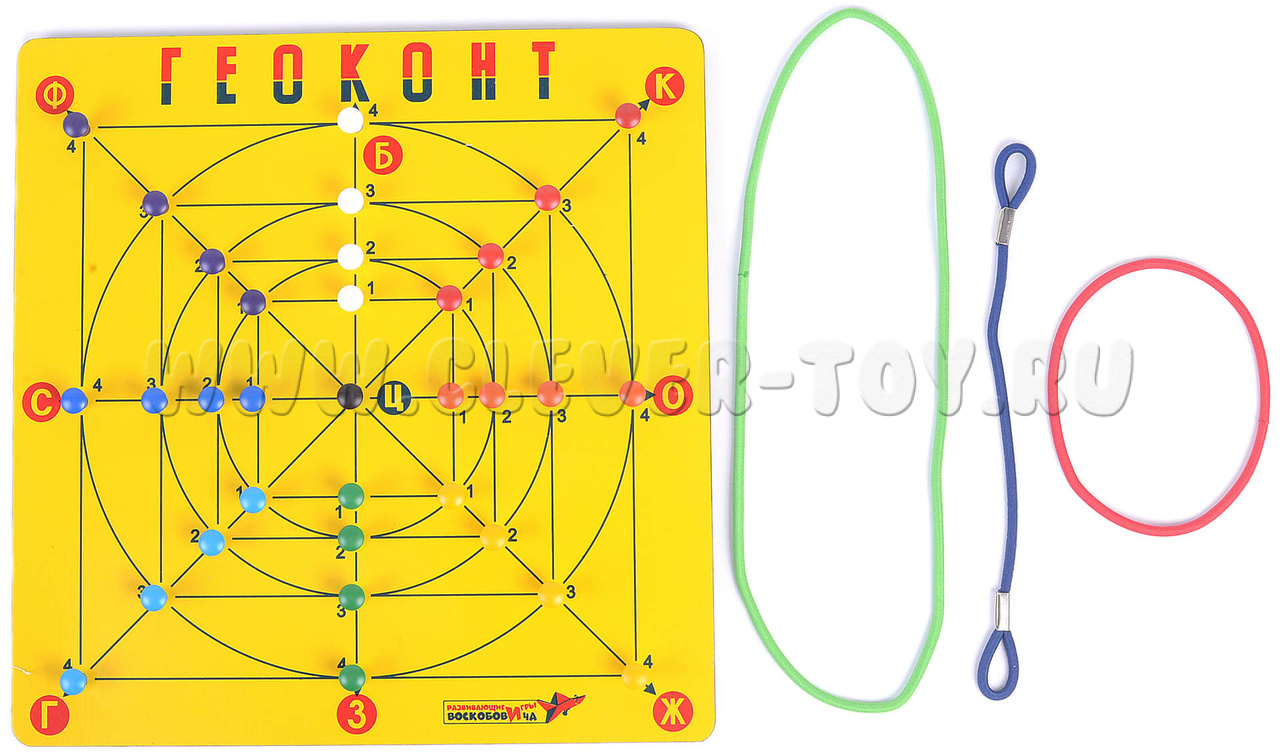 В игре "Геоконт" согласно определенным заданиям, ребенок натягивает резинки на гвоздики таким образом, что создает различные силуэты, геометрические фигуры, узоры, цифры, буквы - по образцу, словесному алгоритму или собственному замыслу.