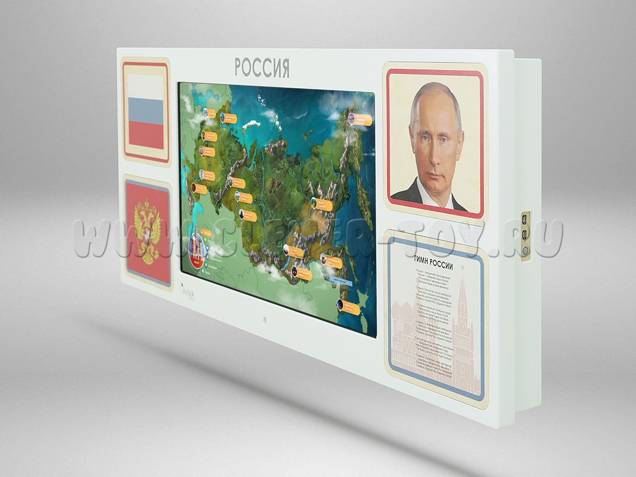 - Интерактивная настенная панель, оформленная основной символикой РФ (43 дюйма, Full HD, мультитач 10 касаний, характеристики встроенного компьютера уточняйте у менеджера)