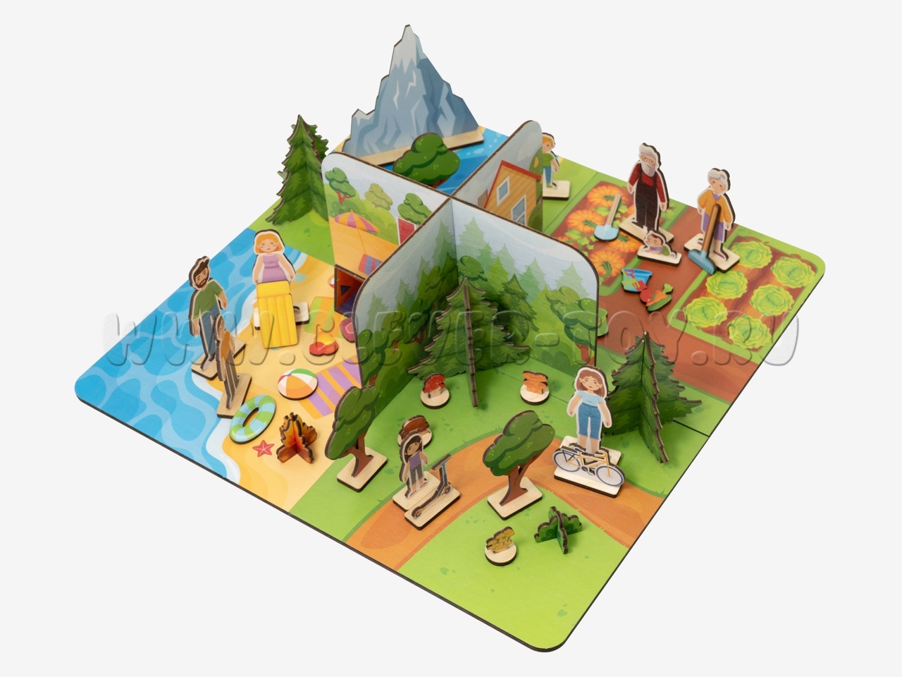 - Путешествие. Локация предлагает площадки для разыгрывания сюжетов семейного досуга в формате путешествий по России (поездка в горы, на пляж/водоем, в лес, на дачу).