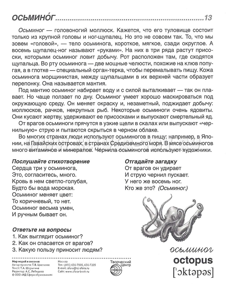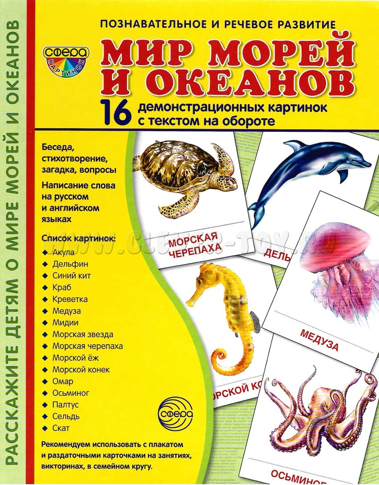 Состав комплекта (16 карточек): Рыбы: акула, дельфин, морской конек, синий кит, палтус, сельдь, скат. Моллюски: мидии, осьминог. Ракообразные: краб, креветка, омар. Беспозвоночные: медуза, морская звезда, морской ёж. Рептилии: морская черепаха.