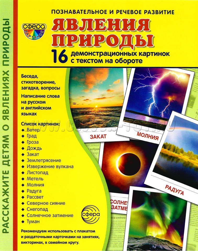 Издательство "ТЦ Сфера" представляет серию "Сфера картинок" под названием "Явления природы". В комплект входят 16 цветных демонстрационных карточек с описанием различных природных явлений.