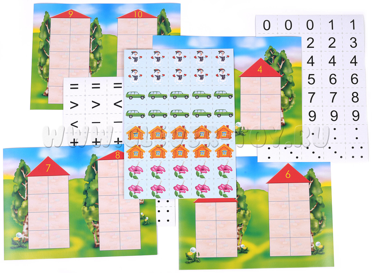В наборе 7 карт формата А4: 8 числовых домиков (от 3 до 10), карточки с цифрами, математическими знаками, точками и предметами. Перед началом игры аккуратно разрежьте карточки по пунктирным линиям. Предложите малышу для начала внимательно рассмотреть цифры, назвать их и выложить в порядке возрастания от 1 до 10. Так же можно выложить карточки с точками (одна точка – единица, две – двойка и т.д. до 10).