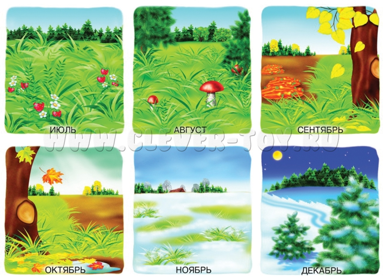 - Месяцы. Раскладываем карточки с месяцами по порядку, рассказываем об изменениях в природе.