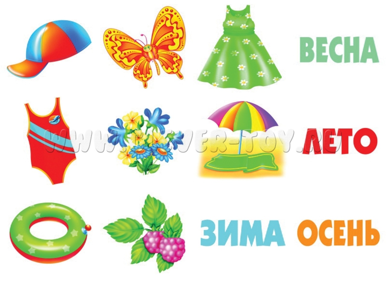 - Времена года. Раскладываем карточки с временами года по порядку, подбираем к каждой подходящие картинки. Теперь можно придумать рассказ о любом времени года.