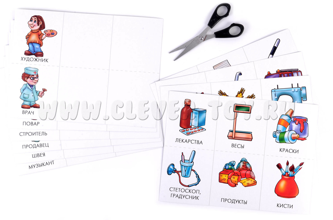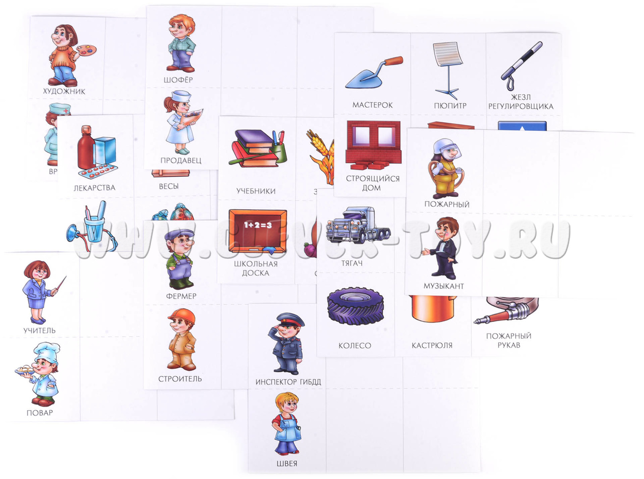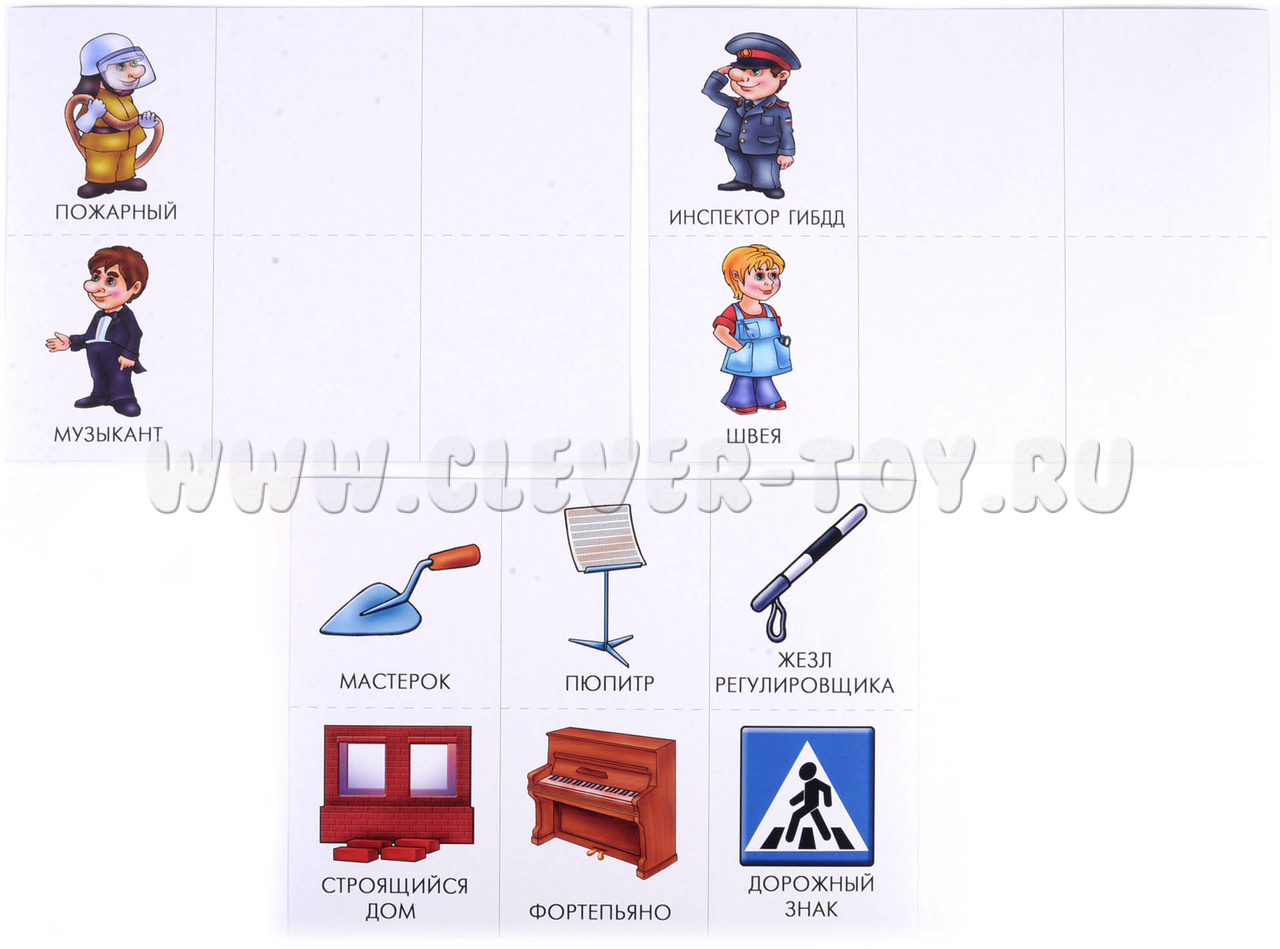 Карточки с предметами раскладываются на большие карты с соответствующими профессиями.