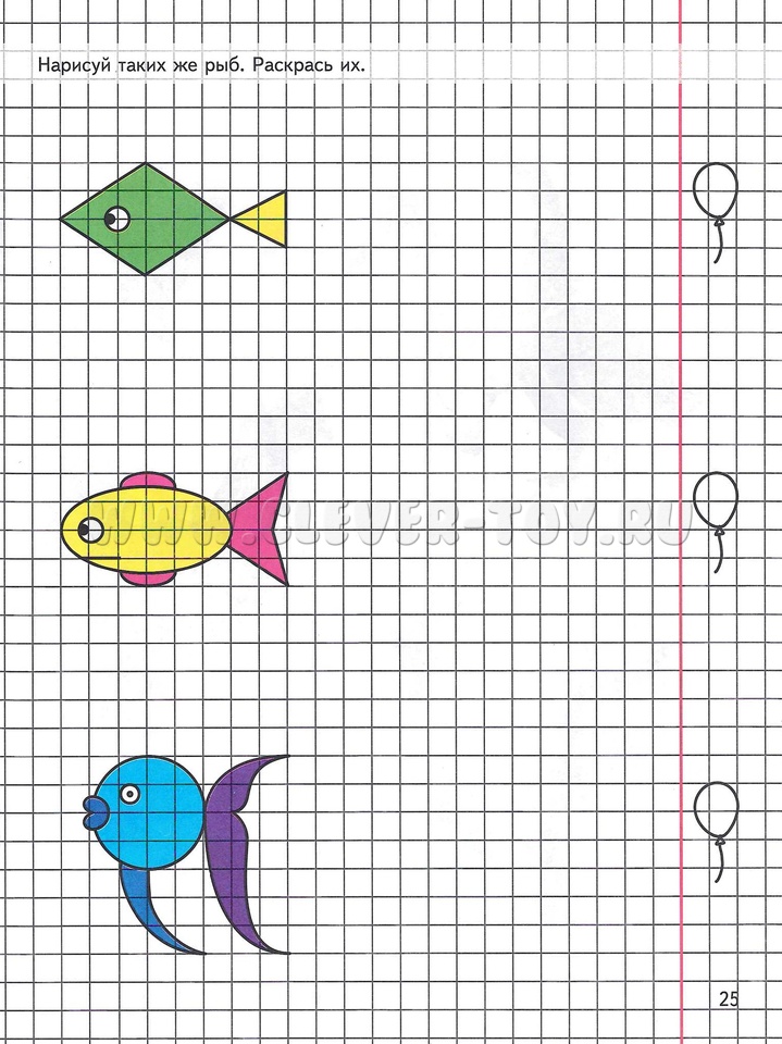 Работа с тетрадью. Рассмотрите вместе живописные иллюстрации, сравните их со схематическими изображениями, помогите ребенку выделить и назвать все геометрические фигуры, из которых состоит изображение, затем он делает это сам. Начинайте с основной части, затем отмечайте форму и расположение остальных частей. При выполнении первых упражнений задавайте ребенку вопросы: "Расскажи, как ты будешь рисовать мишку, зайку?", затем предлагайте задания: "Нарисуй такую же рыбку" или "Нарисуй рыбку, которая плывет в другую сторону" и т.д.