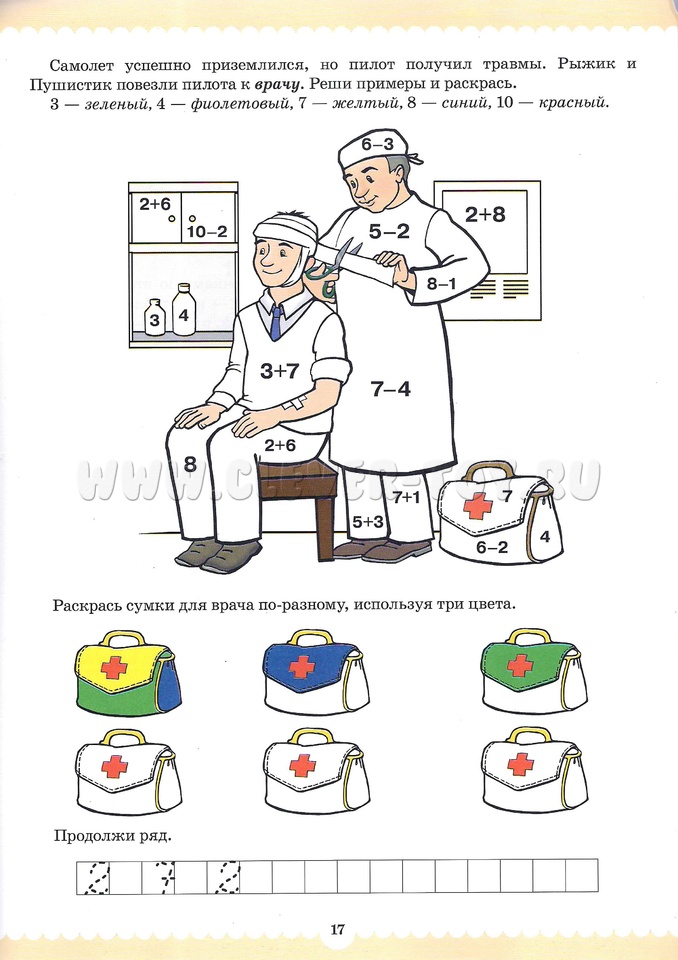 Вместе со сказочными персонажами Рыжиком и Пушистиком малыши, познакомятся с людьми разных профессий, закрепят знания цифр, вспомнят их последовательность в числовом ряду, познакомятся с составом чисел из двух меньших, узнают про сложение и вычитание, про математические знаки, научатся решать простые задачки, писать цифры.