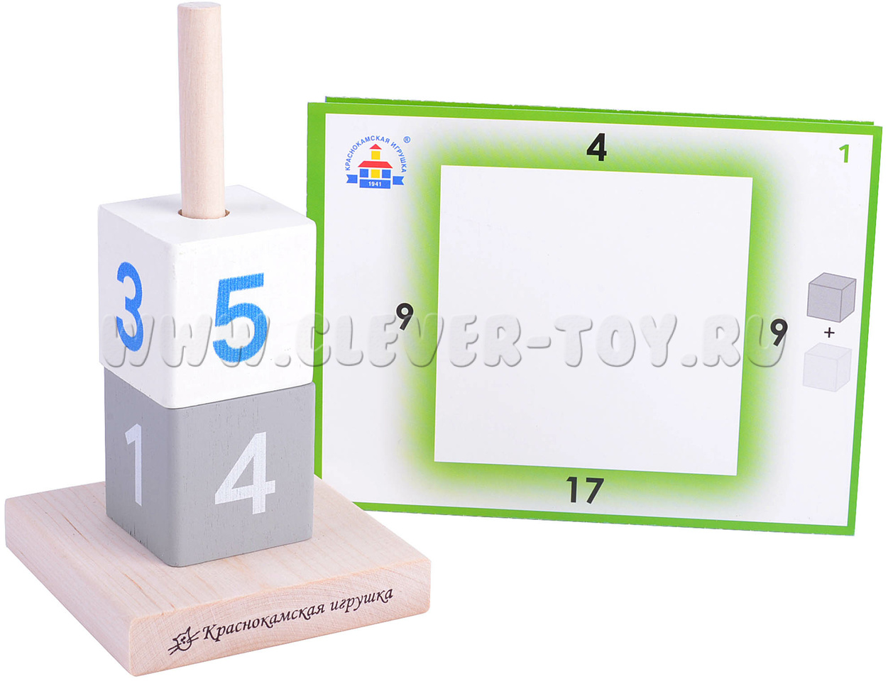 Правила игры на всех 3-х уровнях один - поставьте платформу со штырьком в центр карточки с заданием. Изпользуя 2,3 или 4 кубика тех цветов, которые изображены справа на карточке (в зависимости от уровня сложности). Ребёнку необходимо решить уравнение, то есть подобрать цифры на двух кубиках так, чтобы результаты сложения на всех 4-х сторонах башни совпали со значением на карточке.