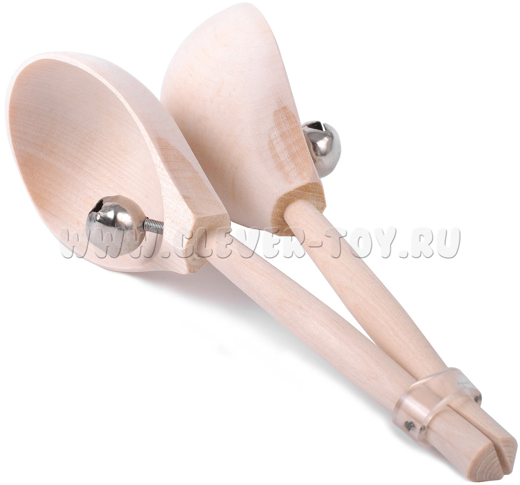 Две деревянные ложки соединены вместе с помощью хлорвинилового кольца диаметром 20 мм. Хвостовики черенков сточены под углом в 45 градусов. В задней части черенков вмонтирован скрытый шип. В каждый из черпаков с наружной стороны вклеено по одному бубенчику. Материал: береза.