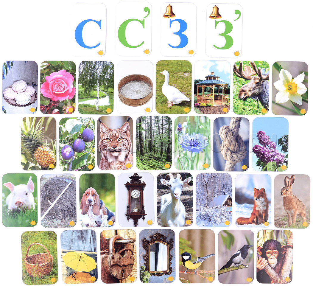 З, С, З’, С’ – Замок, Зонт, Заяц, коЗа, берёЗа, роЗа; Слива, Сорока, Собака, лиСа, коСа, чаСы, ананаС, леС, нарцисС; Зефир, Зеркало, Зима, уЗел, обеЗьяна, корЗина; Сито, Синица, Сирень, пороСёнок, ваСилёк, беСедка, рыСь, лоСь, гуСь.