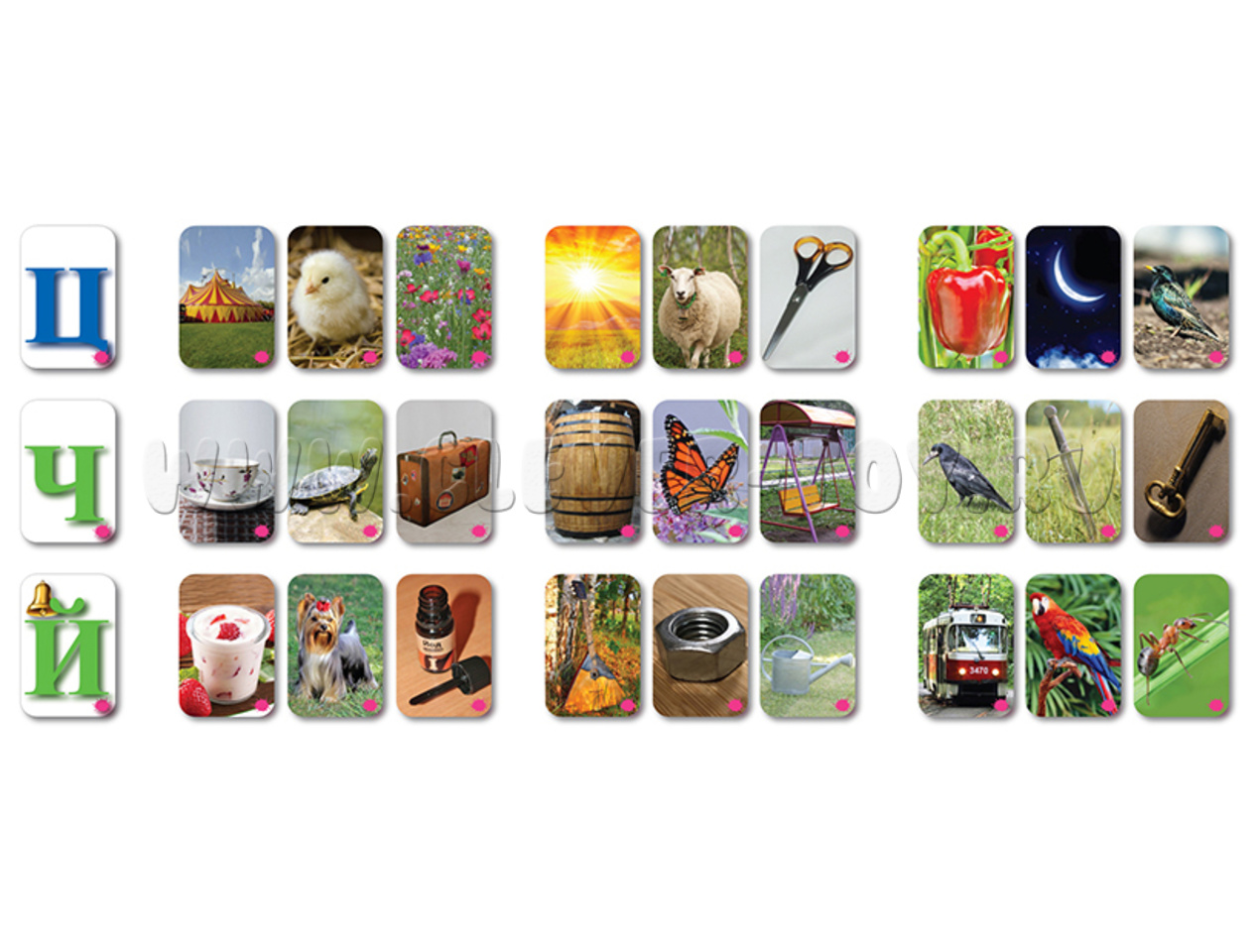 Ц, Ч, Й – Цирк, Цыплёнок, Цветы, солнЦе, овЦа, ножниЦы, переЦ, месяЦ, сквореЦ; Чашка, Черепаха, Чемодан, боЧка, бабоЧка, каЧели, граЧ, меЧ, клюЧ; Йогурт, Йорк, Йод, балалаЙка, гаЙка, леЙка, трамваЙ, попугаЙ, муравеЙ.