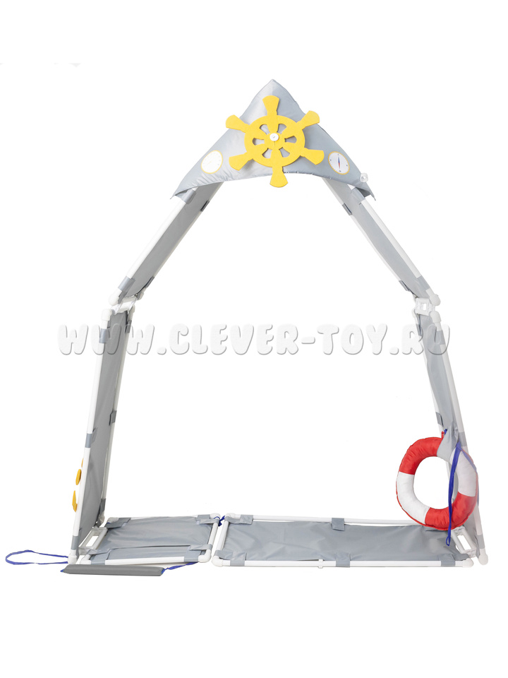 Нос корабля 1 штука - треугольная деталь серого цвета (равнобедренный треугольник, у которого основание 88 см, а две другие стороны 59 см) с наклейками, резинкой для рации и рацией, штурвалом из фетра желтого цвета пристегивающимся на пуговицу.